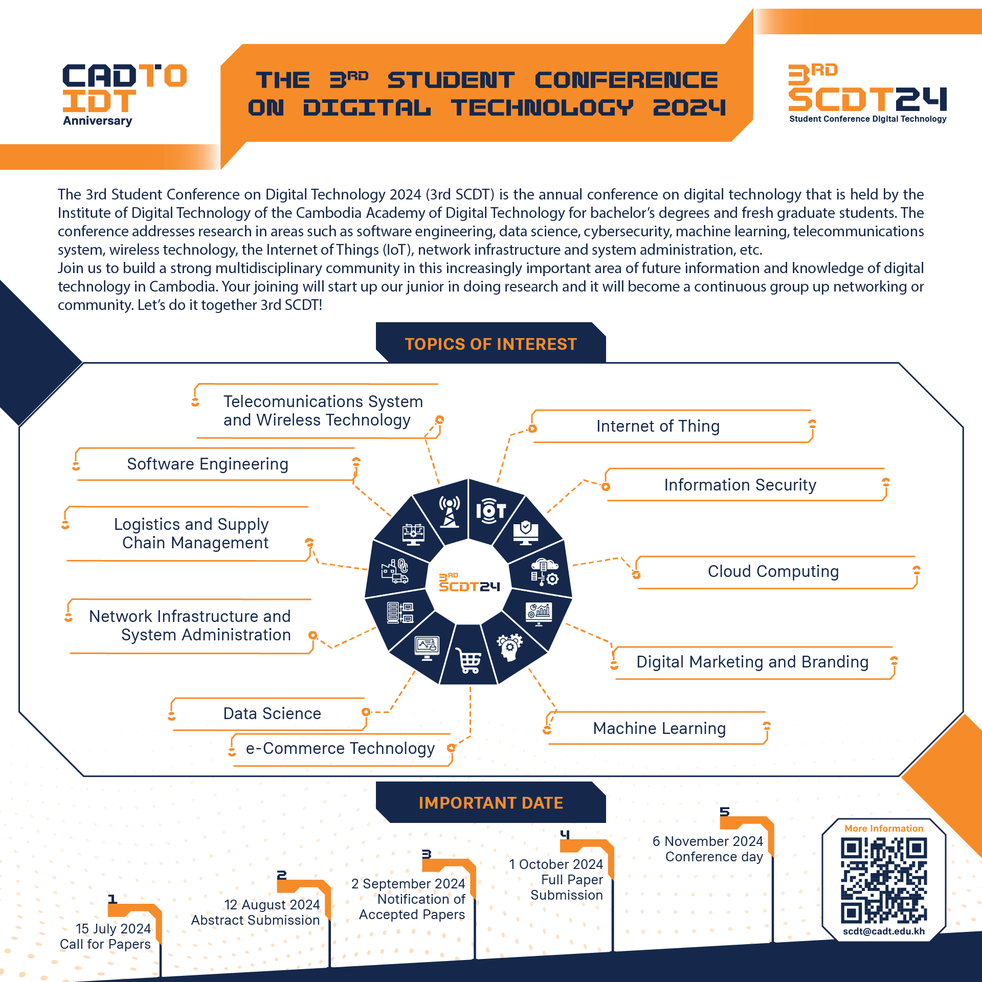 The 3rd Student Conference on Digital Technology 2024 (3rd SCDT) is the annual conference on digital technology that is held by the Institute of Digital Technology of the Cambodia Academy of Digital Technology for bachelor’s degrees and fresh graduate students. The conference addresses research in areas such as software engineering, data science, cybersecurity, machine learning, telecommunications system, wireless technology, the Internet of Things (IoT), network infrastructure and system administration, etc.